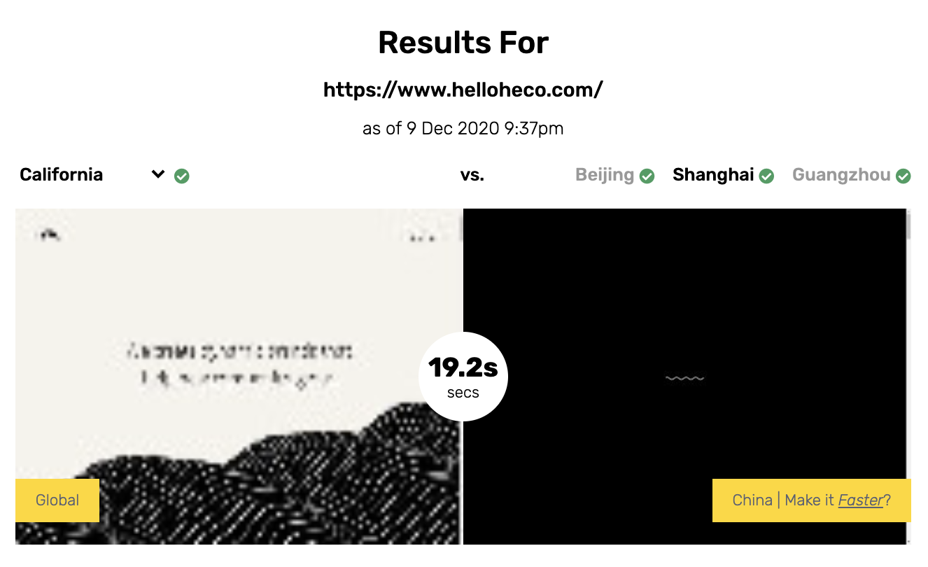 It’s time to see how your site performs in China. Try our Visual Speed Test tool, which lets you test the speed and visual performance of your site loaded in China, in real-time.