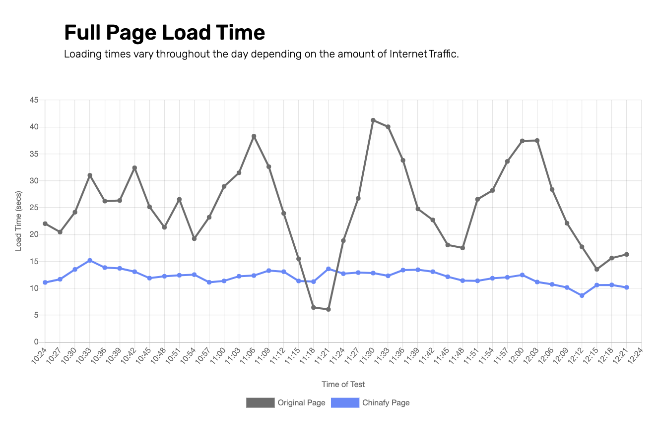 After Chinafy: The website would fully load (including trailing items like trackers) in about 10s in China. The site would visually load in less than half that time.